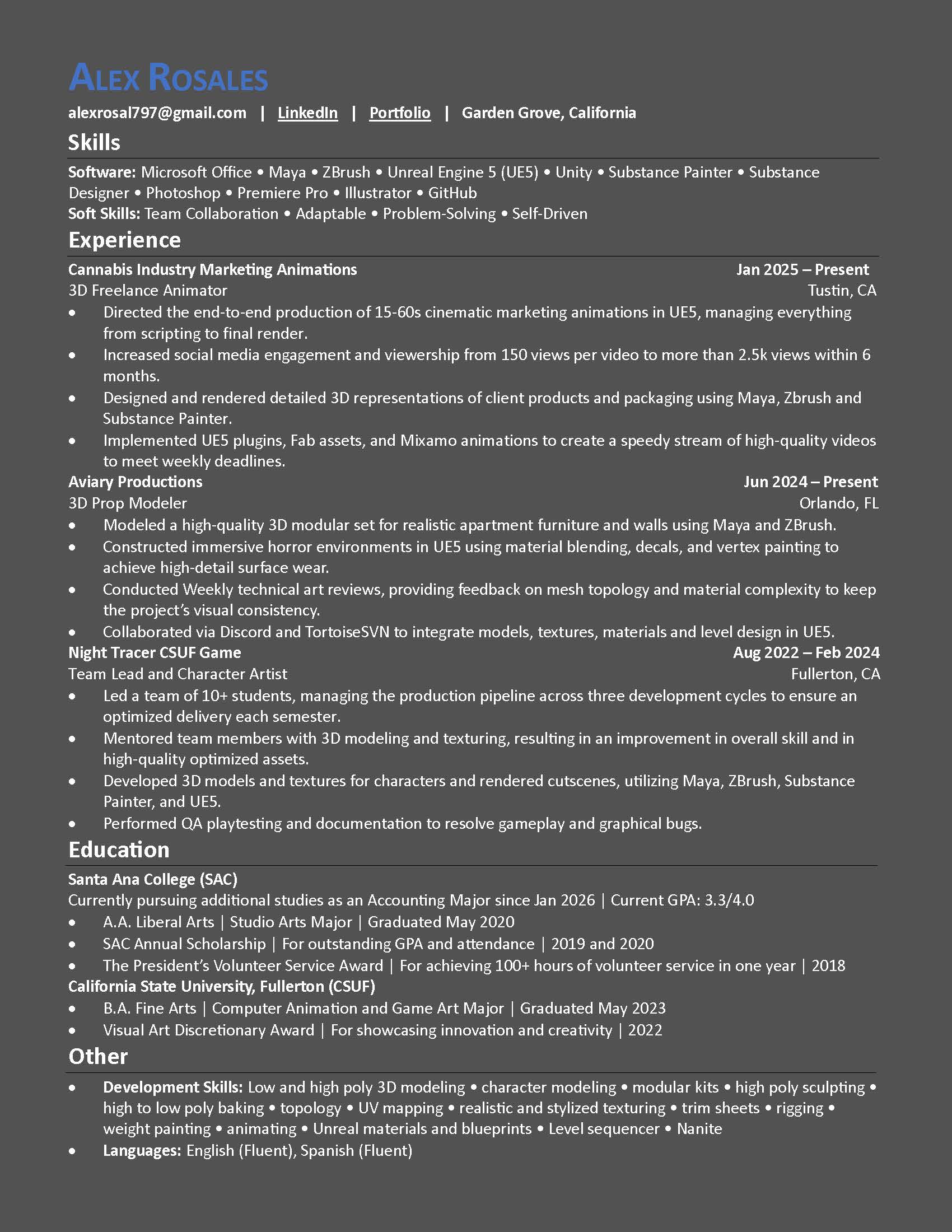 Sophisticated 3D artist with over 3 years of experience working alongside team members to create various video game projects!
